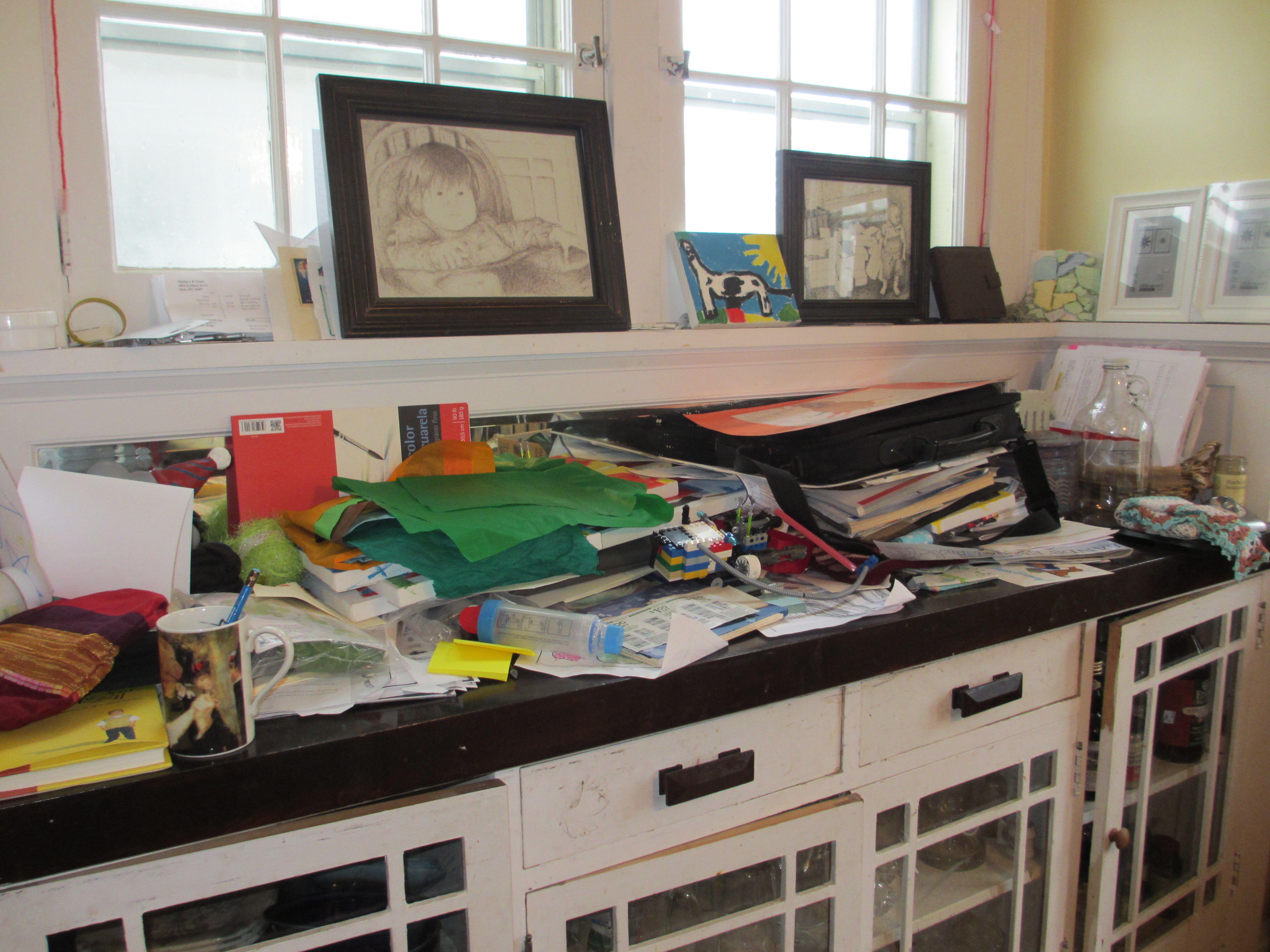 And for those of you who always feel that every blogger has a clean house, the pile on my buffet….
